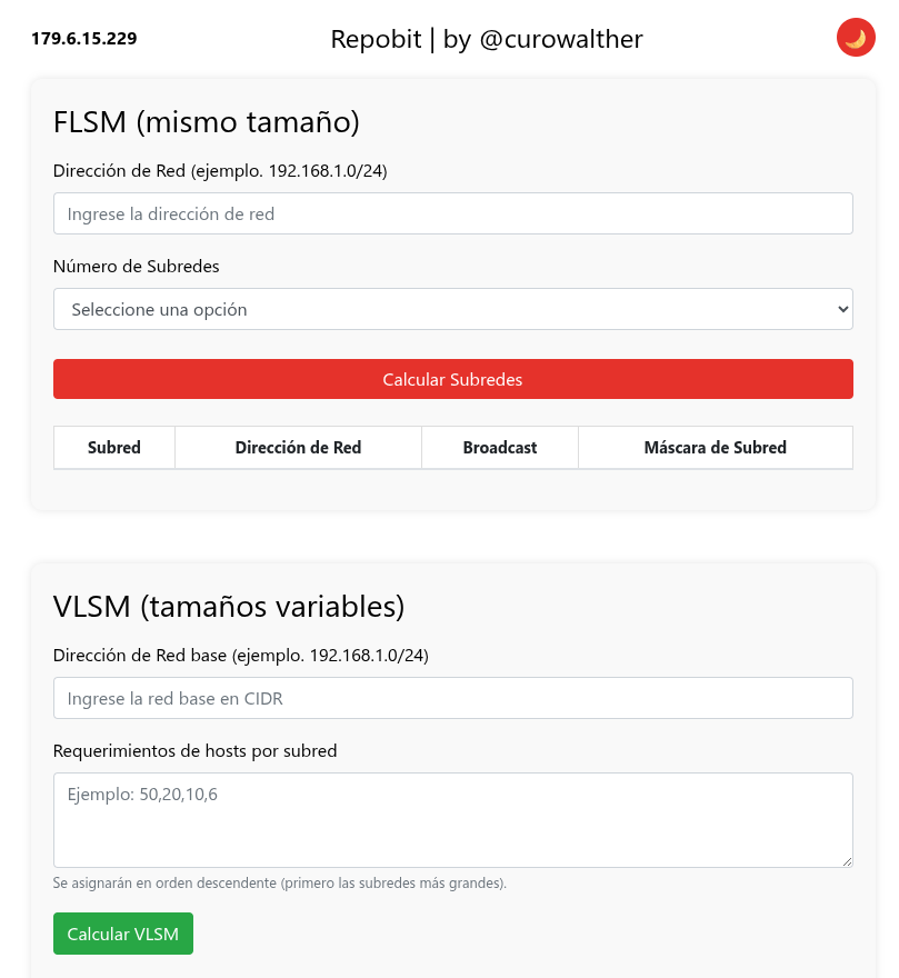 oninput="desplegarSubnets()": Este es un detalle técnico importante. Mientras el usuario escribe la red (ej. 192.168.1.0/24), la función valida el prefijo en tiempo real y llena dinámicamente el elemento <select> con las opciones de subredes posibles basándose en los bits disponibles.