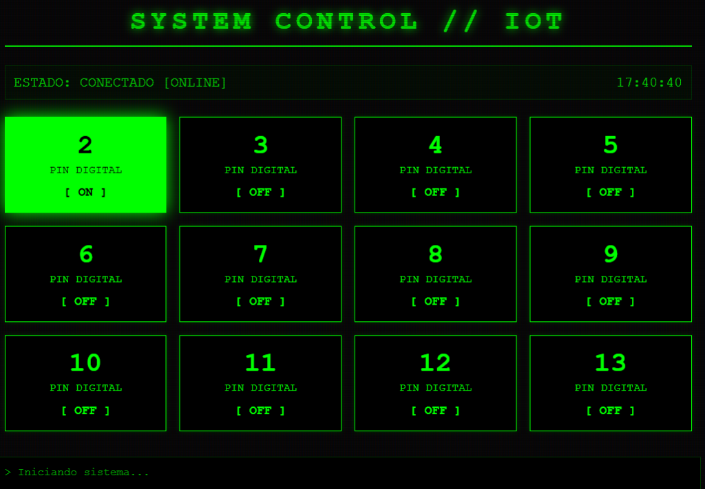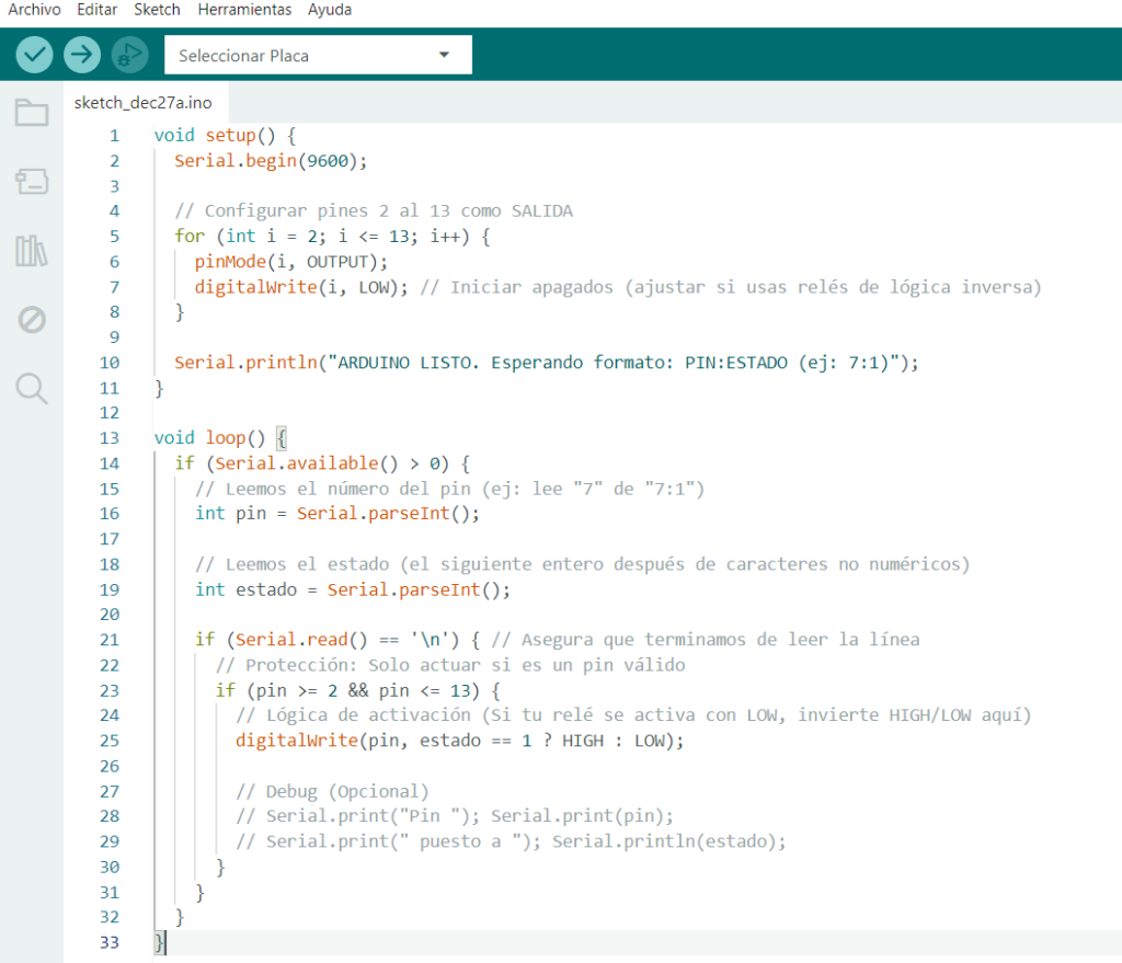 Controlaremos los pines 2 al 13 de Arduino desde una App-Web sencilla y, colocando un relé en cualquiera de los pines, podremos controlar cargas superiores (una bombilla)