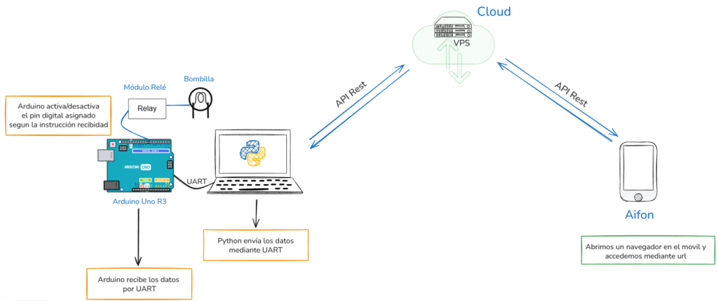 En el computador estará corriendo un Script en Python encargado de consultar la API Rest mediante GET y enviar los datos recibidos hacia Arduino mediante UART.
