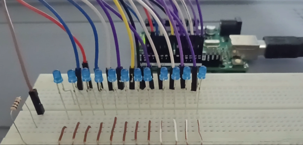 Montar los leds en un protoboard, siendo un led para cada pin digital del 2 al 13 y no olvidar la resistencia de protección (200 ohmios aprox.) a fin de no quemar los leds o el mismo pin digital.